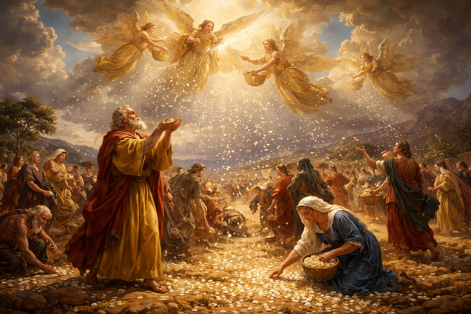 The true bread of our lives comes from heaven, not earth. The sustenance that ultimately satisfies our deepest longings is given by God rather than by human hands. We see this in two distinct examples in both the Old and the New Testament. The first is in Psalms 78:24-25 “24 He rained down manna for the people to eat, he gave them the grain of heaven. 25 Human beings ate the bread of angels; he sent them all the food they could eat.” Manna, whose name comes from the Hebrew question "man nah?" meaning "What is it?", is the miraculous food provided by God to the Israelites during their forty years in the wilderness. Hebrew Scriptures describe it as a small, flake-like substance appearing on the ground each morning. It sustained the people when no other provisions were available. And beyond its physical nourishment, it was collected daily (except on the Sabbath), with strict instructions not to be hoarded.